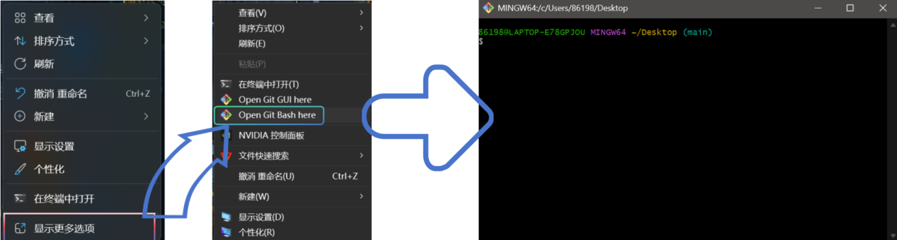 如果没找到,点击最下方的 显示更多选项,切记是==git bash==(不是git GUI),然后就会看到这个命令行,就可以开始输入代码了。(接下来就不会用cmd了)