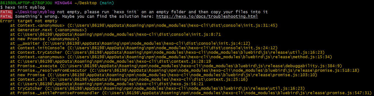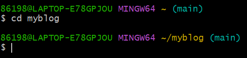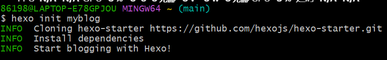 1 | hexo init myblog //hexo init 自己取的博客名,这一般会在c盘里面(记得找到位置) |