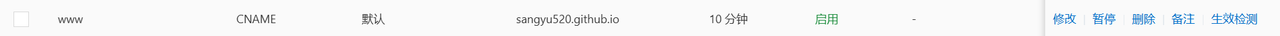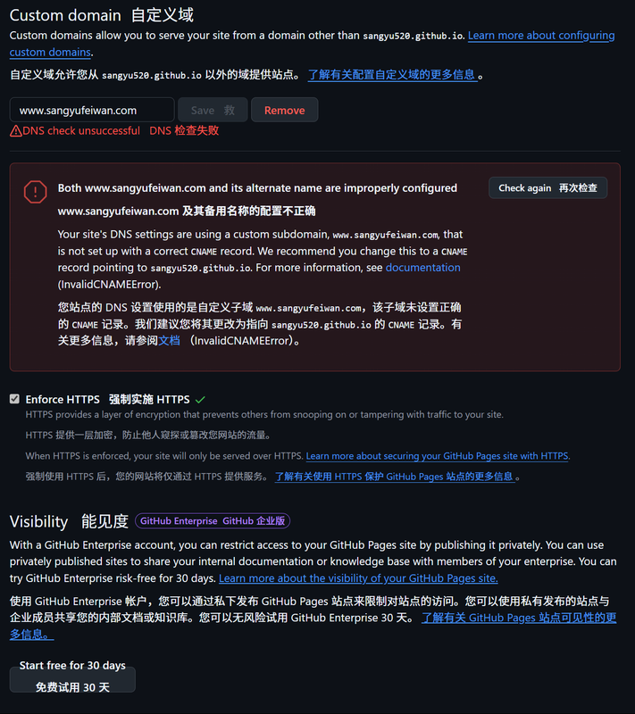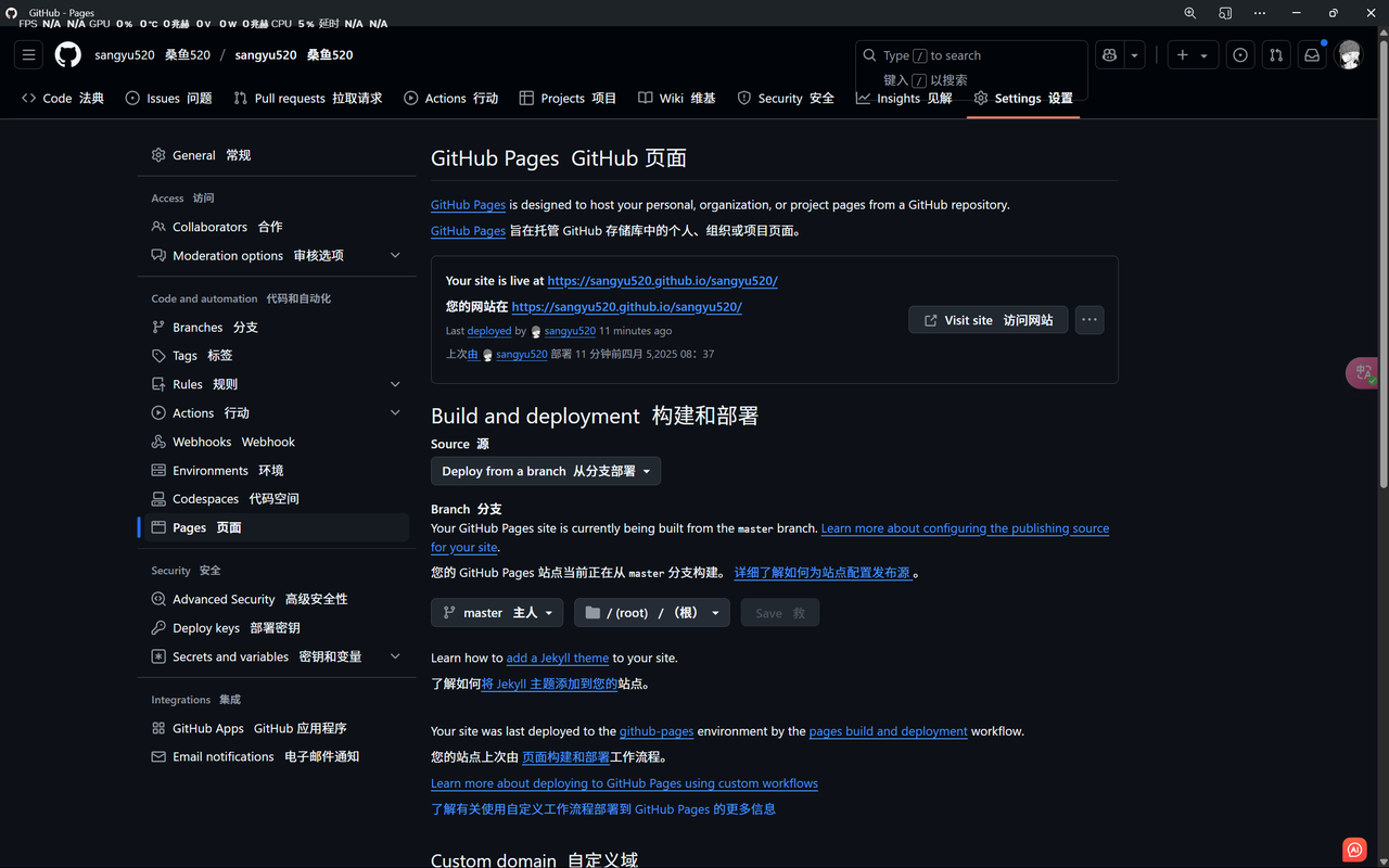 登录GitHub,进入之前创建的仓库,点击settings,设置Custom domain,输入你的域名sangyufeiwan.com