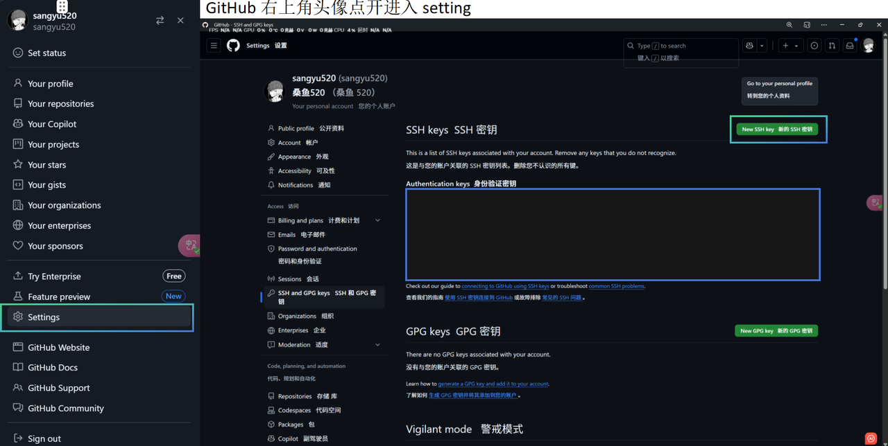 而后在GitHub的setting中,找到SSH keys的设置选项,点击New SSH key把你的id_rsa.pub里面的信息复制进去。