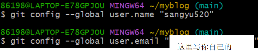 这里的yourname输入你的GitHub用户名,youremail输入你GitHub的邮箱。这样GitHub才能知道你是不是对应它的账户。