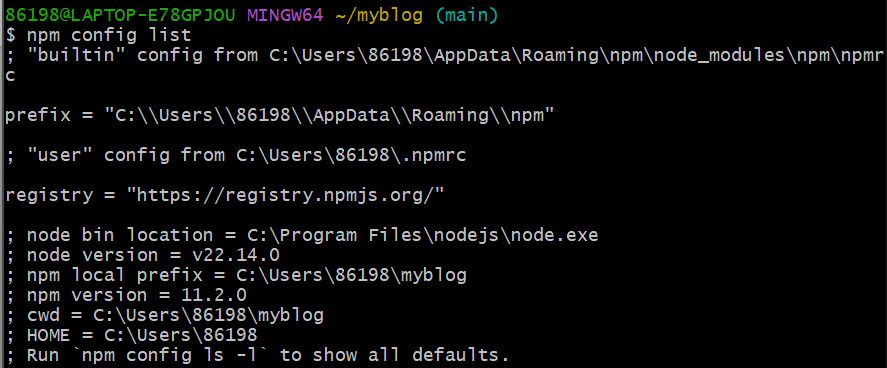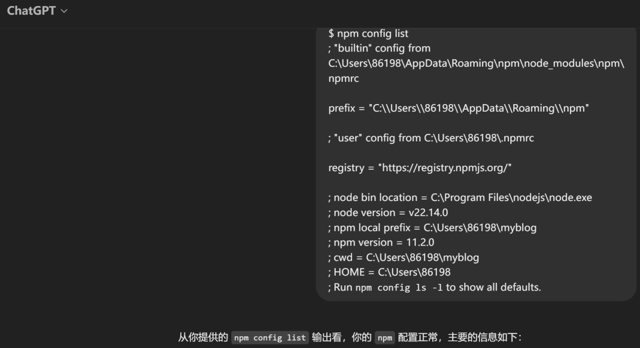 这将显示你的 npm 配置文件内容,包括注册表、代理设置等。如果你看到异常的配置,可能需要进行修改。