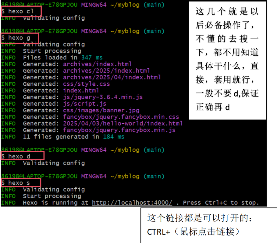 其中 hexo clean清除了你之前生成的东西,也可以不加。(我习惯加了)
