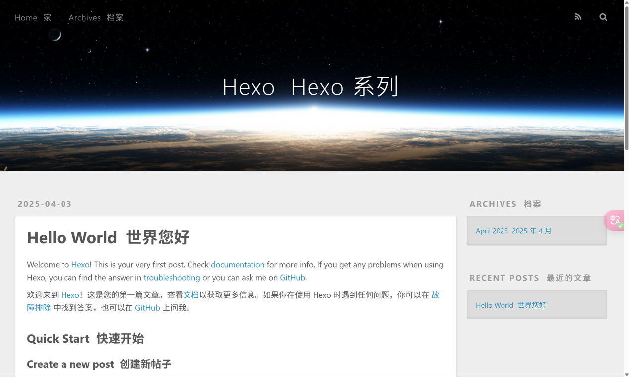 我们的第一个博客网页就搭建好了,当然,这远远不够,我们要美化和部署,加域名绑定服务器才算一个精美的blog,还可以创主副页