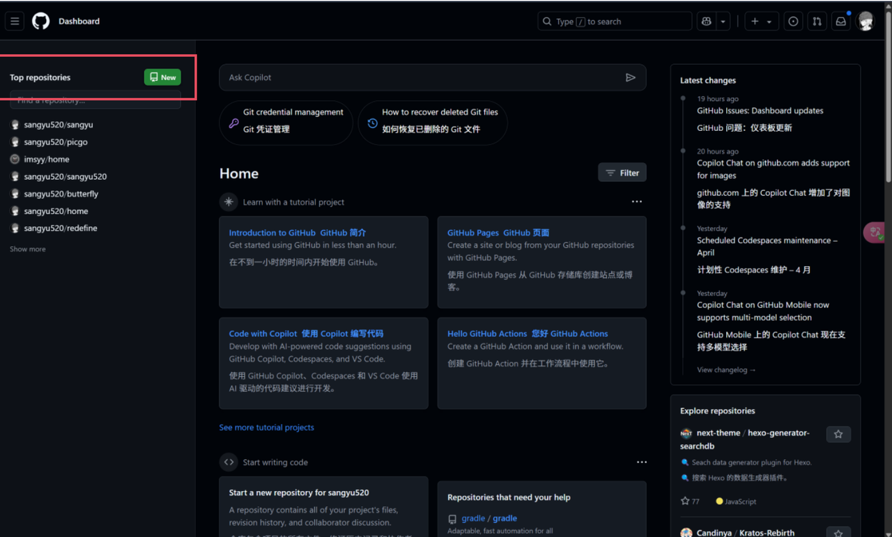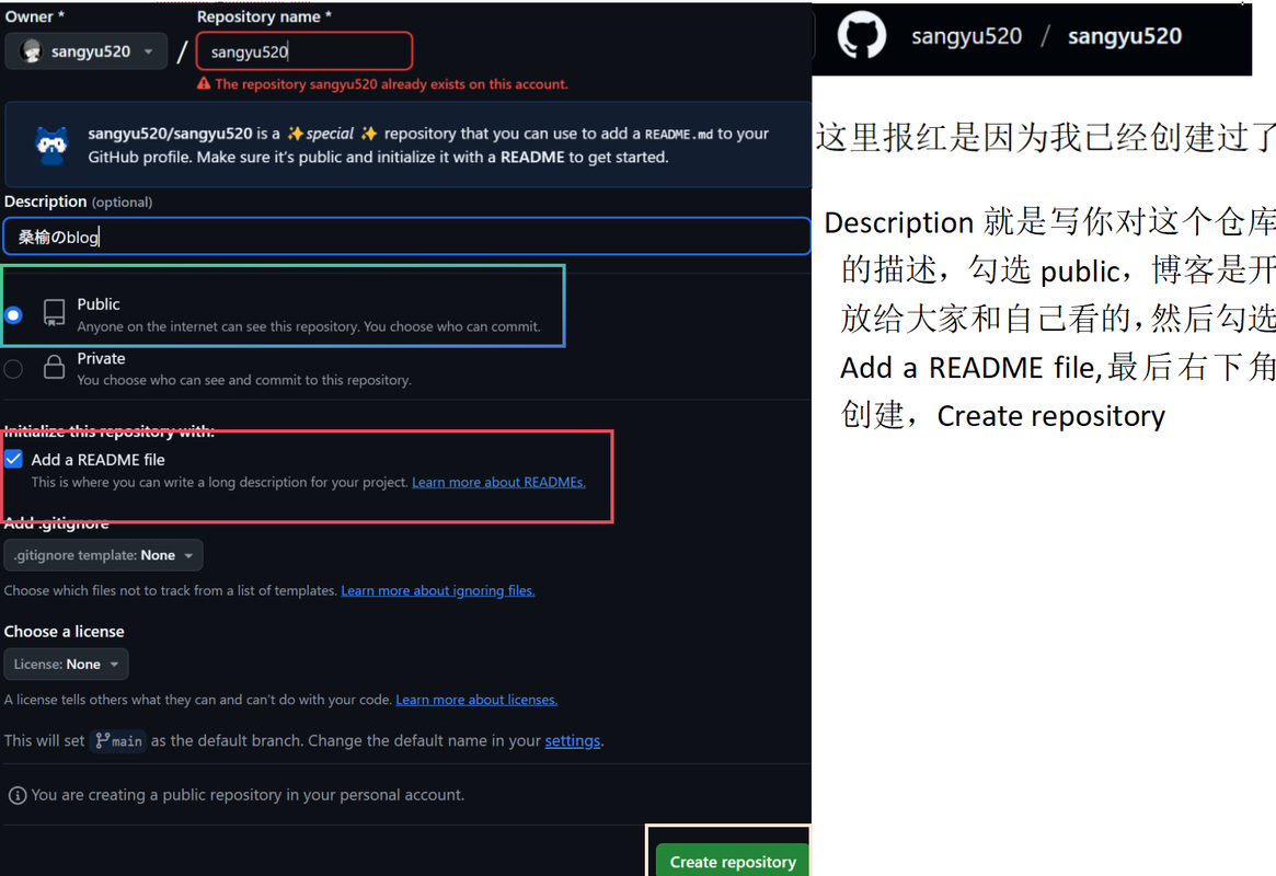 如果你是第一次搭建,我建议创建一个和你用户名相同的仓库,只有这样,将来要部署到GitHub page的时候,才会被识别,也就是xxxx.github.io,其中xxx就是你注册GitHub的用户名(主要是避免一些麻烦,新手能简单点就好)